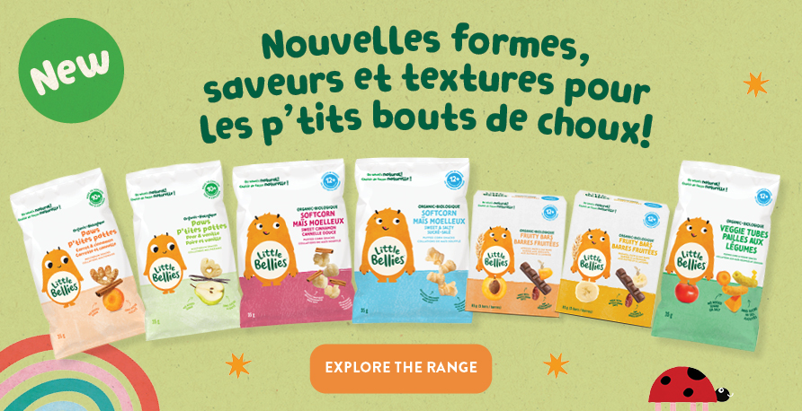 Nous avons une foule de jeux Little Bellies conçus pour faire jouer les petits doigts! Lorsque cela est possible, intégrez de nouveaux groupes d’aliments dans votre jeu. Par exemple, associez les anneaux de maïs moelleux Little Bellies pour créer une fleur avec des bleuets, des fraises et des concombres. Cette création simple et fleurie contient quatre groupes d’aliments! Vos créations n’ont pas besoin d’être parfaites ou difficiles à préparer. En fait, elles devraient être simples, interactives et salissantes! Pour votre enfant, la valeur réside dans la démarche et non dans le résultat.
