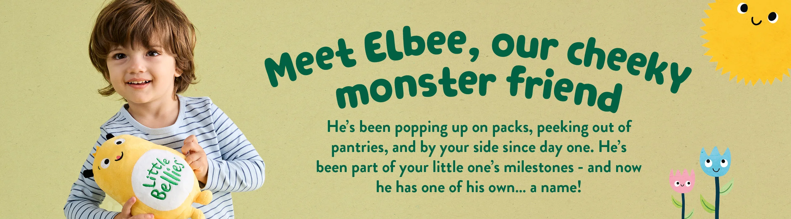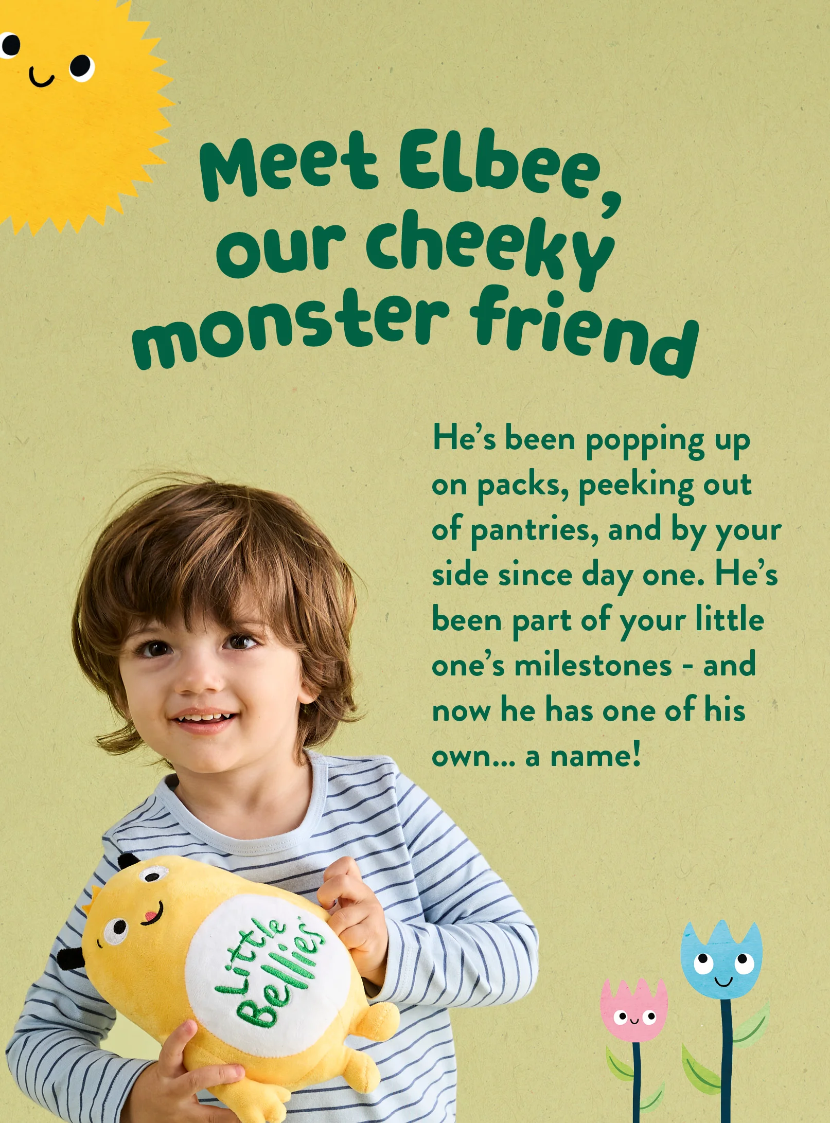 You might have spotted him peeking out from Little Bellies packs, pantries, and even playtime moments at home. He’s our cheeky, mischievous friend who’s been alongside parents and little ones through the messy, magical milestones of growing up. Now he has a forever name – Elbee – a part of the Little Bellies family just like you.