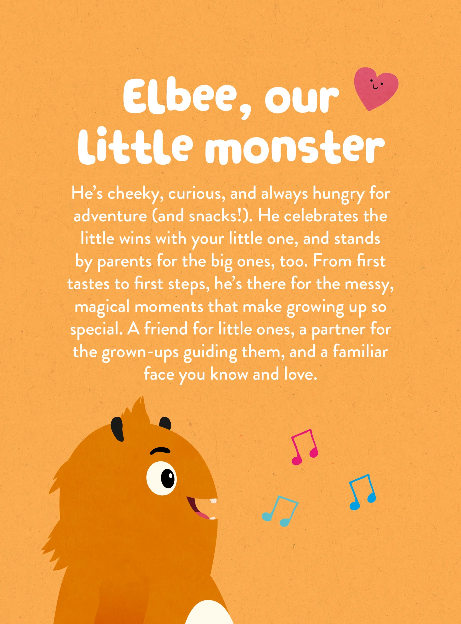 Elbee is cheeky, curious, and full of fun. He loves story time on the couch, snack time with little ones, and joining in on new adventures big and small. Exploring, playing, and sharing food with families makes him happiest – especially when there’s plenty of giggles and a little bit of mess.