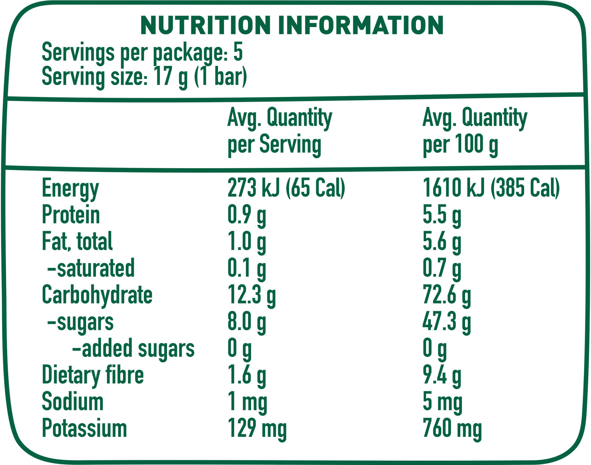 We don’t use cane sugar or add simple sugars such as rice syrup, honey, or maltodextrin. Where flavour is required, we simply use dried organic fruit. That’s it – nothing else is added or taken away.